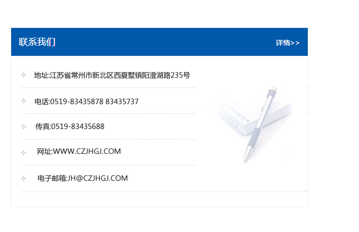 地址:常州市新北區友邦商務大廈1幢16、17層  電話:0519-85101652  傳真:0519-85112595  郵編:213022  網址:www_cz-jiayue_cn.fz-mechanics.com  郵箱:xiajifengaa@163.com